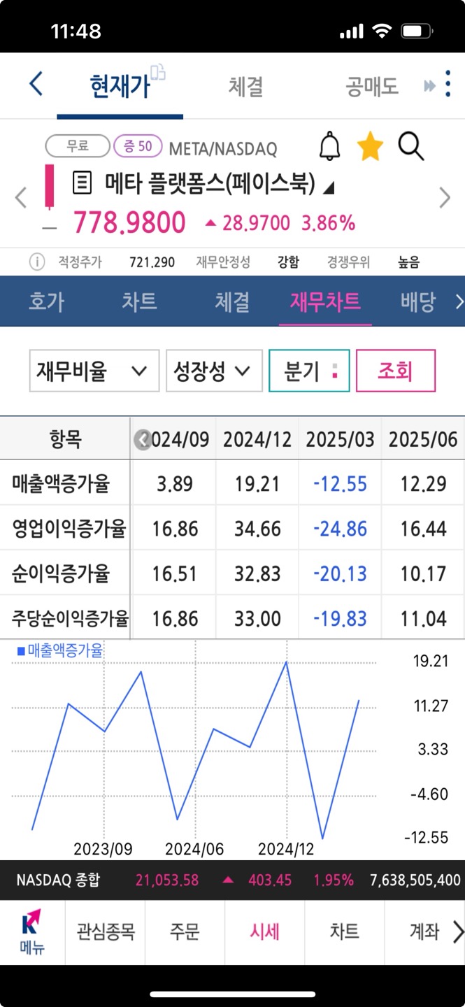 분기 메타 매출액과 주당순이익증가율표